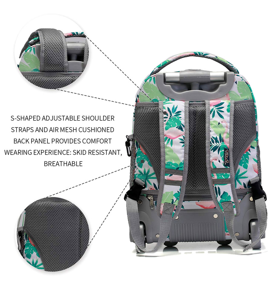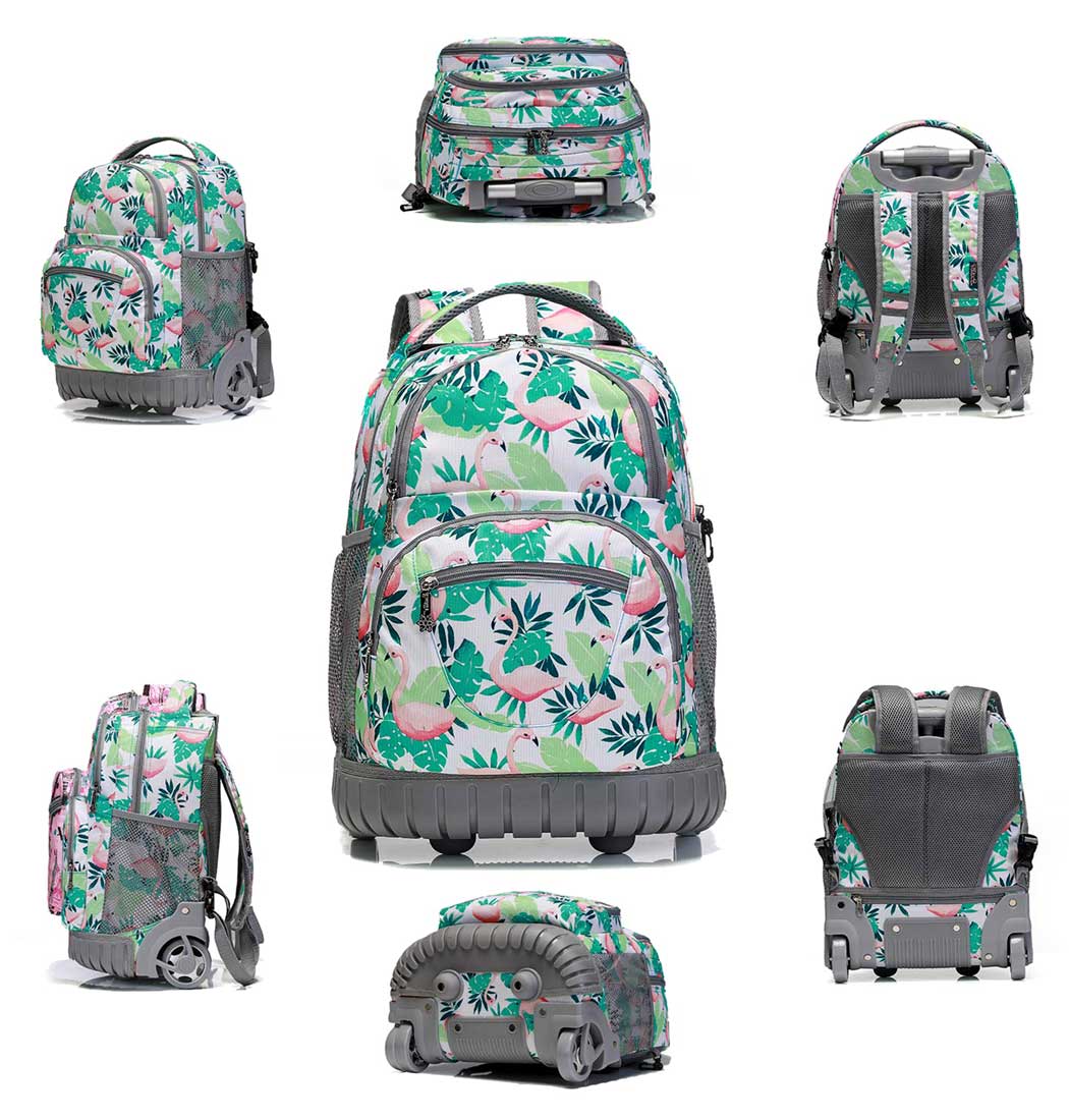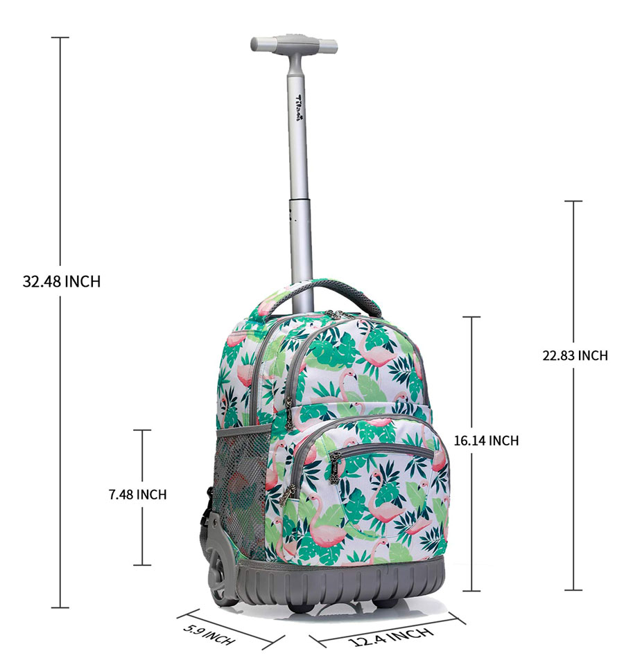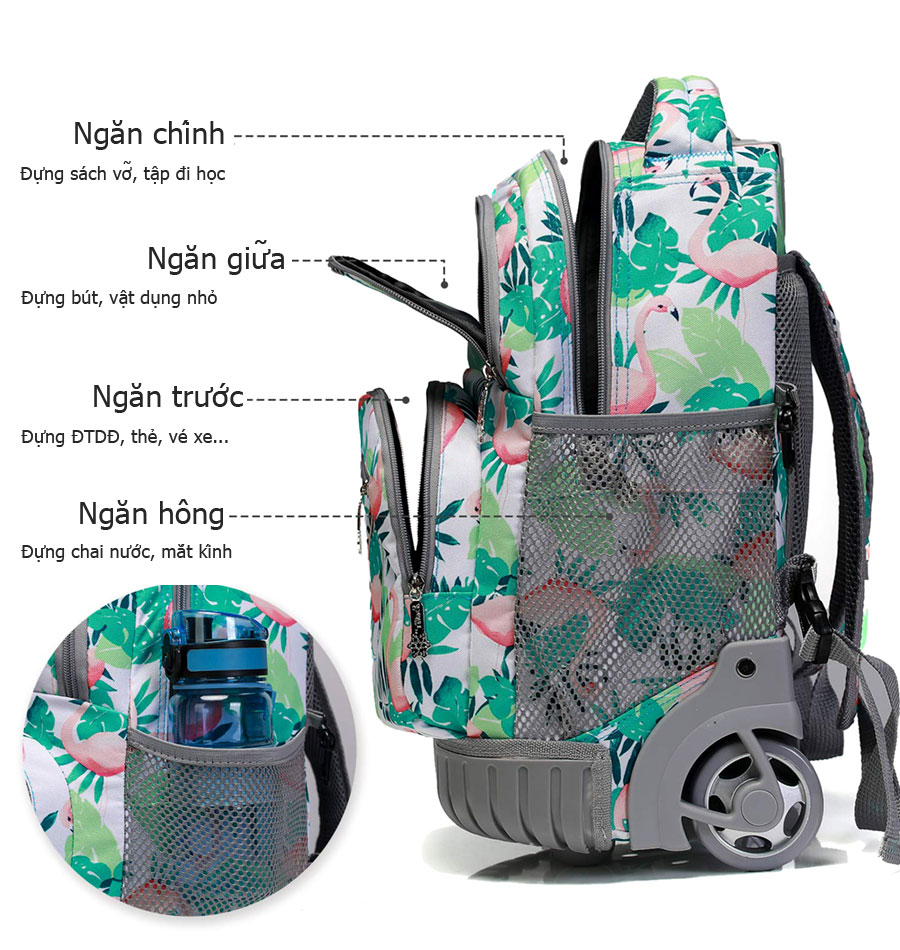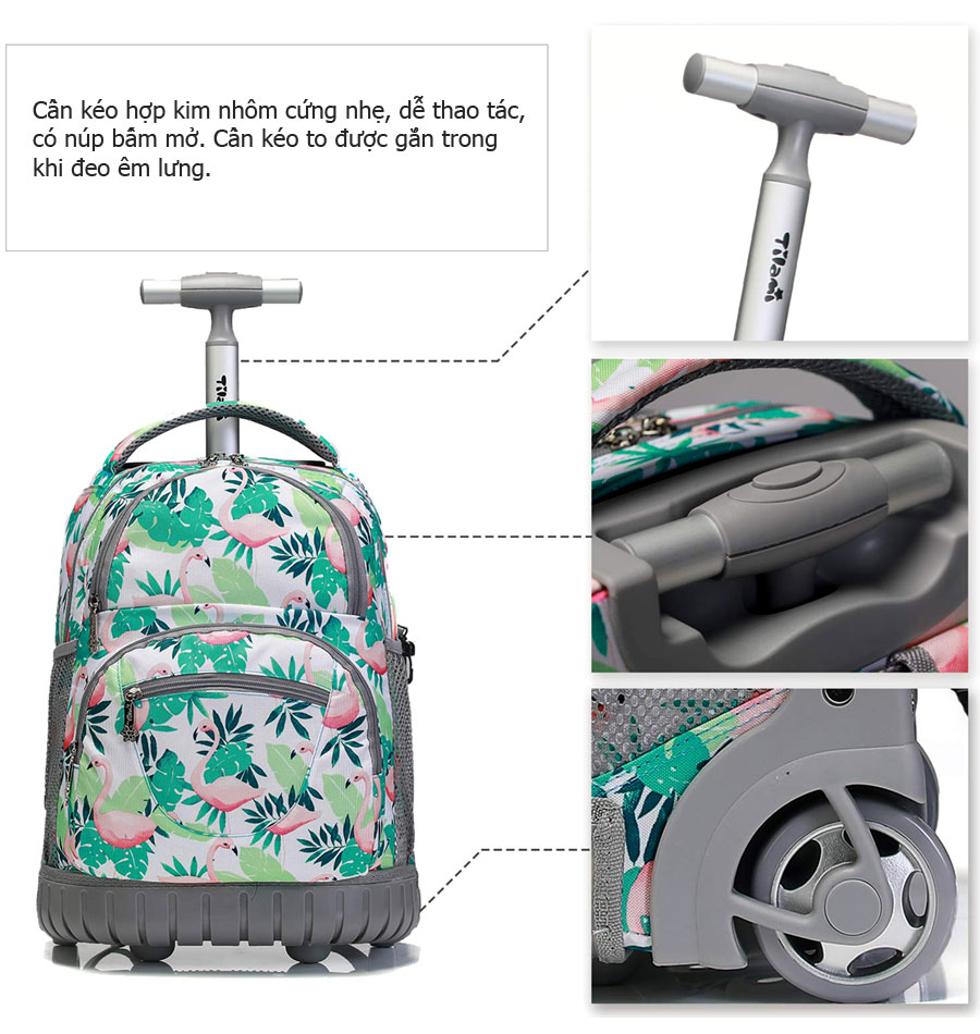 Balo kéo học sinh tiểu học TM201A họa tiết đẹp hình chim hạc đáng yêu phù hợp với trẻ em gái. Nội thất có một ngăn chính, hai ngăn phụ cùng các túi nhỏ đựng bút, thẻ, vật dụng nhỏ riêng lẻ, ngăn nắp.
