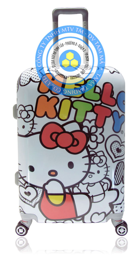 Vali nhựa Hello Kitty cute. Vali Hello Kitty màu trắng sữa viềng xám có bốn bánh xe xoay 360 độ. Hello Kitty chất liệu nhựa bóng màu trắng thời trang phù hợp nhiều lứa tuổi. Hiện có cỡ nhỏ 5 tấc đựng 7kg và cỡ trung 6 tấc đựng được 20kg hành lý.