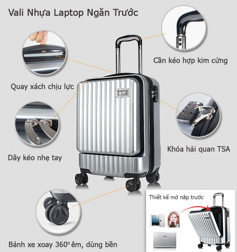 Vali nhựa kiểu mở nắp trước đựng Laptop có khóa TSA TM535 sử dụng bộ bánh xe cao cấp xoay nhẹ và êm. Nội thất nhiều ngăn phụ và túi nhỏ giúp việc thu xếp hành lý gọn gàng, ngăn nắp. Cần kéo hợp kim cứng chỉnh độ cao dễ dàng theo ý muốn, có chất lượng tốt dùng bền.