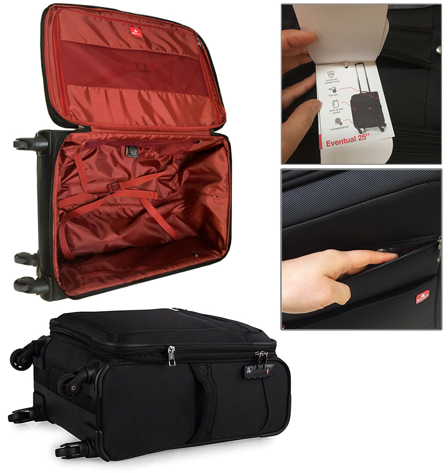 Vali vải cao cấp chống nước Swiza Eventual Size 25 đen TM415 thiết kế mở rộng được, có kích cỡ lớn hơn so với các mẫu Vali size 24, sức chứa lên đến 23Kg đến 25Kg hành lý xếp chung nhóm vali đựng quần áo du lịch (Size 23 24 25 26) khi đi máy bay phải ký gởi. Nội thất màu đỏ đậm sang trọng được chia tách 80/20, một bên ngăn lưới, chiếm 20% thể tích, một bên ngăn chính, có hai dây cố định hành lý chiếm 80% thể tích chứa được năm đến bảy bộ đồ, đôi giày cùng vật dụng linh tinh khác.